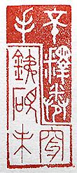 縦横・・4.9×2.1cm 『三國志』呂蒙傳注引江表傳の一語と、『新五代史』桑維翰 傳の一語を、古璽文の朱白で刻した、「手不釋卷鐵硯未穿 」(手は卷を釋かず鐵硯は未だ穿たず)で、常に手から書物 を離さず、堅い意志で學問に励む事である。江表傳には、 「光武兵馬の務に當るも手は卷を釋かず、・・・卿何ぞ獨り 自ら勉せざるや」と有り、桑維翰傳には、「鐵硯を鑄し以 て人に示して曰く、硯弊るれば則ち改めて佗仕せんと、卒 に進士及第を以てす」と有る。己を省みるに、果たしてここ まで學問に励んだのだろうかと思う。確かに漢籍を手放す 事は無かったが、結局はそこそこだった様に思う。何處か にこれで良いかと言う思いが無かったとは、決して言い切 れ無いのである。古人の言葉を見るに付け、悔悟の思い が己の胸底を掻き毟る。 |