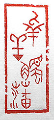 縦横・・4.9×2.1cm 『易經』大壯の一語を、金文で刻した「羝羊觸藩」(羝羊 藩に觸る)で、蛮勇に任せて突っ走る者は、失敗して進 退極まる事の例えである。大壯には、「羝羊藩に觸れ、 退くこと能はず、遂ぐること能はず、利しき攸无し」と有る 。因みにこれは、一番腹の立つ失敗作である。彫り上が ったのでさて押印をと思い、印泥を付けてたら「觸」字の 一部と「藩」字の米の一部分が消えてしまった。内部に ヒビでも有ったらしく細かい線が取れてしまった。全くお 笑い種の間抜けな「藩」字になってしまった。 |