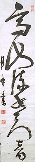 紙本肉筆・・縦130cm、横29.5cm 「高山流水知音」の六字である。「月堂書」の下に、陰 刻回印の「源照成印」と陽刻「字子成」の落款が押され ている。榊原月堂は江戸の人で、名は照成、字は子成 、号を月堂と称し、久能山の神官を司り、越中守を称 して書・画を善くした幕臣であるが、能書家の浅野長厥 や戸川安清らと交遊し、著名儒者の書を集めて『儒林 墨宝』を刊行し、草書の名手としても知られた能書家で もある。 |