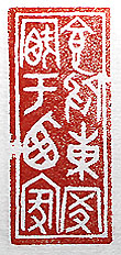 縦横・・4.8×2cm 『藝文類聚』卷四十の婚に引用されている、後漢末應 劭の『風俗通義』の兩袒の故事をアレンジして、古璽文 で刻した「食於東家宿于西家」(東家に食し西家に宿す )で、兩方の良いとこ取りをする例えである。風俗通義 には、「俗説に、齊人に女《むすめ》有り、二人之を求 む、東家の子は醜にして富み、、西家の子は好にして 貧、父母疑ひて決すること能はず、其の女に問ひ適か んと欲する所を定めんとし、指斥して言ひ難くんば、偏 袒し我をして之を知らしめよと、女便ち兩袒す、怪みて 其の故を問ふ、云ふ、東家に食し西家に宿するを欲す と」と有る。まあ有り體に言へば、男女を問わず良く有 る話である。 |