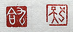 縦横・・1×1cm 唐の李白の「望廬山瀑布」の一語を、甲骨文で刻した「九 天」で、一番高い天の事である。亦た『論語』憲問篇の一 語を金文で刻した「九合」で、責め糾して集め合わせる事 である。望廬山瀑布には、「飛流直下三千尺、疑ふらくは 是れ銀河の九天から落つるかと」と有り、憲問篇には、「桓 公の諸侯を九合するに、兵車を以てせざるは、管仲の力な り」と有る。今は「急轉直下」と書くが、本來は「九天直下」 であり、「九合」は「糾合」でもある。 |