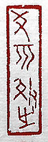 縦横・・3.8×1cm 『春秋左氏傳』僖公二十四年の一語を、甲骨文で刻した 「尤而効之」(尤めて之に効ふ)で、他人の不正を尤めな がら、己も同じ様な不正を行う事である。僖公二十四年 には、「尤めて之に効ふは、罪又甚し」と有る。得てして 聲高に他人を非難する人ほど、この様な傾向が見られ る。所で、印泥を付けていたら「効」の字の線が壊れてし まい、情けない「効」になった。 |