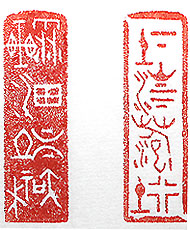 縦横・・5×1.5cm 己の田舎に「たわのうち」と言う地名が有る。どんな漢字 か考えていたが、やっと思い出した。其の結果遊び心に 突き動かされて、方言漢字を刻してみる事にした。方言 漢字とは國字漢字の中で、特定の地方で地名や人名だ けに使われる漢字である。當然中國には無いので全て 作字である。金文で刻した「あくつ、土+下」(茨城県)、「 どんど、水+山+上+下」(福井県)、「やち、水+艸+包 」(東北地方)、「がけ、土+行」(埼玉県)、甲骨文で刻し た、「そり、車+雪」(東北地方)、「さこ、水+田」(四國地 方)、「たわ、土+上+下」(中國地方)、「なぎ、木+知」( 京都府)、の八字である。 |