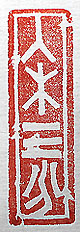 縦横・・5×1.5cm 『説郛』卷九十二引『書斷』の王羲之の項の一語を、金 文で刻した「入木三分」(木に入ること三分)で、筆勢或 いは筆壓が極めて力彊い事の例えである。王羲之が 木に書き付けた文字の墨が、三分の深さまで染み込ん でいた、と言う故事に基づく言葉である。書斷には、「晉 帝時に北郊に祭り、更めて版を祝し、工人之を削れば、 木に入ること三分」と有る。 |