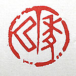 縦横・・3×3cm 甲骨文で刻した「麥曲」で、所謂「酒」である。麥と曲を合 わせると「麯」字になり、「麯は麴と同じ」でこうじの意味で 、要するに「麥曲」は「麴」となり、「麴」から「酒」が作られ るので、結局「麥曲」は「酒」を表すと言う事になる、尚、 酒を表す言葉に「麥曲之英」とか「米泉之精」とか有るが 、此は、白居易の「酒功賛」に基づく言葉で、其處には 、「麥麴の英、米泉の精、合作して酒と爲る」と有る。 |