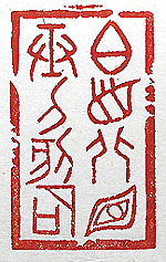 縦横・・5×3cm 己の現状を甲骨文で刻した、「白首北面弄刀刻石」(白 首は北面し刀を弄び石を刻す)で、老人に成っても誰か に教えを請い、石を彫り續けている、と言う事であるが、 教えを請いての石彫りは、年に數點に過ぎず、日々の 石彫りは、刀任せ記憶任せの單なる言葉彫りである、南 面されている師には、寔に申し譯ない氣がするが、如何 せん老人の樂が勝ってしまうのである。尚、前半の「白 首北面」は、『文中子中説』立命篇に有る言葉で、其處 には、「白首北面は豈に年を以てせんや、(賈)瓊之を 聞く、コは年に在らず、道は位に在らずと」と有る。 |