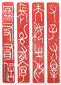 縦横・・6.6×1cm 『孟子』滕文公上に有る五教の一節を、古璽文で刻し た「父子有親」(父子に親有り)と、甲骨文で刻した「夫 婦有別」(夫婦に別有り)と、金文で刻した「長幼有序」 (長幼に序有り)と、印篆で刻した「朋友有信」(朋友に 信有り)の四教である。滕文公上には、「教ふるに人倫 を以てす、父子親有り、君臣義有り、夫婦別有り、長幼 序有り、朋友信有り」と有る。 |