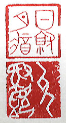 縦横・・2.4×2.4cm 『詩經』周頌敬之の一語と『新唐所』魏徴傳の一語を、戰國 篆文で刻した「日就月將」(日に就り月に將む)で、學問や 技術が日々進歩向上する事である。亦た甲骨文で刻した 「以人爲鑑」(人を以て鑑と爲す)で、他人の態度や行爲を 己の誡めとする事である。敬之には、「日に就り月に將み、 學は光明に緝熈すること有らん」と有り、魏徴傳には、「銅 を以て鑑と爲し、衣冠を正す可し、古を以て鑑と爲し、興替 を知る可し、人を以て鑑と爲し得失を明かにす可し、・・・今 魏徴逝く、一鑑亡べり」と有る。 |