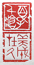 縦横・・2.4×2.4cm 韓愈の「與孟尚書書」の一語と『荘子』人間世の一語を、金 文で刻した「百孔千瘡」で、短所や欠點が多く有る事である 。亦た戰國篆文で刻した「美成在久」(美の成るは久きに 在り)で、善美が實現されるには、長い時間が必要である と言う事である。與孟尚書書には、「羣儒區區として修補す れども、百孔千瘡隨ひて亂れ隨ひて失す、其の危きこと一 髪の千鈞を引くが如し」と有り、人間世には、「令を遷し勸 め成すは殆事なり、美の成ること久きに在り、悪の成るは 改むるに及ばず、愼まざる可けんや」と有る。 |