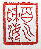 縦横・・3×2.5cm 『淮南子』氾論訓の一語を、金篆で刻した「百川歸海」( 百川海に歸す)で、衆目の考えや衆人の心が、一點に集 中する事、或いはばらばらに存在したものが、一カ所に 集まる事である。氾論訓には、「百川源を異にして皆海 に歸し、百家業を殊にして皆治に務む」と有る。最近、力 が彊い者が横暴な行爲を取っても、表面上は百川海に 歸すが如く、追随して其れを容認する言動が發せられ るのは、何か空恐ろしい氣がしてならない。 |