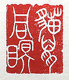 縦横・・3×2.5cm 『新唐書』五行志一の話をアレンジして、戰國篆文で刻 した「猫鼠同眠(瞑)」で、上の者と下の者が結託して悪 事を行う事の例えである。五行志一には、「洛州、猫鼠 處を同じくす、鼠隱伏するは盗竊に象る、猫は捕噛を職 とするも、反りて鼠と同じくす、盗を司る者、職を廢して姦 を容るるに象る」と有る。「猫鼠同處」でも良いが、上と下 が互いに持ちつ持たれつで視て見ぬ振りをして悪事を 働くのであれば、「同處」より「同眠」の方が、インパクト が有る様に思う。孰れにしても、悪代官と悪徳商人の關 係圖である。 |