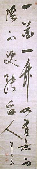 紙本肉筆・・縦126.3cm、横27.8cm 「關思恭」の側に、陰刻回印「關思恭印」と陽刻「本姓伊 藤」の落款が押されている。關鳳岡は江戸の人で、名は 思恭、字は子肅、号を鳳岡・恭黙齋などと称し、水戸藩 士伊藤祐宗の四男で、本姓は伊藤氏であるが、関家の 養子となり、関姓を名乗り出す。初め太宰春台に儒学を 学び、同時に細井広沢に書を学んで、土浦藩に祐筆とし て仕えた儒臣であるが、「門弟五千人」とか、「草聖」とか 称された能書家でもある。 |