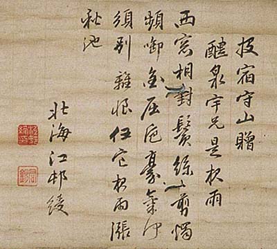 紙本肉筆・・縦22cm、横28cm 「北海江邨綬」の横に、陰刻「江邨綬印」と陽刻「君錫」の落款が 押されている。江邨北海は明石の人で、名は綬、字は君錫、号 を北海と称し、福井藩儒伊藤龍洲の次男で、明石藩儒の梁田 蛻巌に学び、二十二歳で父に代わり経史を講説し、朱子学を奉 じて詩文に長じ、詩社賜杖堂の盟主となっている。その後宮津 藩儒江邨毅庵の養子となって江邨姓を名乗り、宮津藩に仕えて 儒臣となるが、晩年は京に家塾対梢館を開いて、門弟の教授に 専念している。当時、大阪の片山北海・江戸の入江北海と共に 「三都の北海」と称され、また兄の伊藤錦里・弟の清田タン叟と共 に、「伊藤の三珠樹」とも称されている。 |