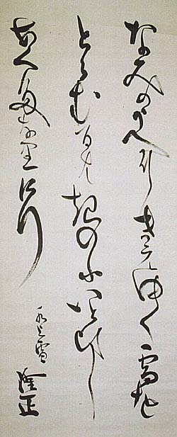 紙本肉筆・・縦126cm、横52.5cm 「隆正」の署名が有る。大國葵園は石見の人で、 本姓は今井氏であるが、野之口と改め、更に大國 と改めている。名は隆正、字は子蝶、号を葵園・ 佐紀乃屋などと称し、初め平田篤胤の門人となり、 次いで昌平黌の古賀精里に学び、後に村田春門 に師事し、京で家塾報本学舎を開いて講説を始め るが、津和野藩に召されて藩校養老館で子弟の教 育に従事し、次いで福山藩の藩校誠之館で皇学を 講じた国学者で、和歌や草書も善くしている。 |