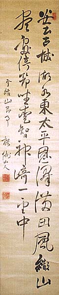 絖本肉筆・・縦134cm、横27.5cm 「櫻洲山人」の下に、陰刻「中井弘印」と陽刻「櫻洲」の 落款が押されている。中井櫻洲は薩摩の人で、名は 弘、号を櫻洲と称し、初めは藩校造士館で学んで和漢 の学を修めるが、十八歳で脱藩して国事に奔走し、維 新後は滋賀県知事・京都府知事・元老院議官などを歴 任した政治家で、格調を旨とした詩文を善くし、その交 友も広く伊藤博文・井上馨・後藤象二郎らとは、三十年 来の莫逆の交わりを結んでいる。 |