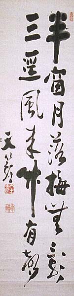 紙本肉筆・・縦136cm、横34cm 「天籟」の下に、陰刻「大木遠」と陽刻「天籟」の落款が 押されている。大木天籟は佐賀の人で、名は遠吉、号 を巳堂・天籟などと称し、伯爵の貴族院議員で、原内閣 や高橋内閣で司法大臣、加藤内閣で鉄道大臣などを歴 任した政治家であるが、大東文化大学設立に関わった 中心的人物の一人でもある。大正期に入り、漢学振興 が声高に言われ出し、その為の協議会が市村サン次 郎・牧野謙次郎・内田周平・松平康國・小川平吉・江木 千之・大木遠吉等々の参加を得て、華族会館に於いて 数回開かれ、大正十二年二月十一日に「大東文化協 会」が創立されるが、その協会の初代会頭が大木遠吉 である。 |