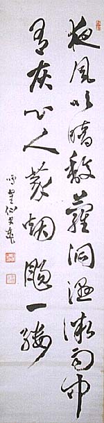 紙本肉筆・・縦138.5cm、横34.5cm 「鳴鶴仙史東作」の下に、陰刻「日下東作之印」と陽刻 「子暘父」の落款が押されている。日下部鳴鶴は近江 の人で、名は東作、字を士(子)暘、号を翠雨・鳴鶴・ 鶴廬などと称し、維新後大久保利道の信任を得て、内 閣大書記官となるが、利道死後は退官して書に一生 を捧げた人で、初めは卷菱湖の風を習うも、貫名ッ翁 に私淑し、楊守敬の来朝に当たり書法を問い、更に中 国に渡って兪曲園や呉昌碩らと交わり、格調高い書を 著し、近代随一の大家と称される書家である。 |