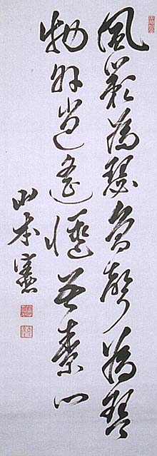 紙本肉筆・・縦86cm、横32cm 「山本憲」の下に、陰刻「憲之印」と陽刻「梅崖」の落 款が押されている。山本梅崖は土佐の人で、江戸末 の儒者山本澹齋の孫で、名は憲、字は永弼、号を 梅崖と称し、初め家学の徂徠学を修め、十四歳で藩 校致道館に入って福岡清馬や大橋真三らに学び、 維新後は洋学を学んで独・英語を修めて政府に仕 えるも、家学の儒学で身を立てるべく職を辞し、一 時新聞記者として時勢を論じたりするが、明治22年 に家塾梅清処塾を開いて講説を事とした漢学者で ある。 |