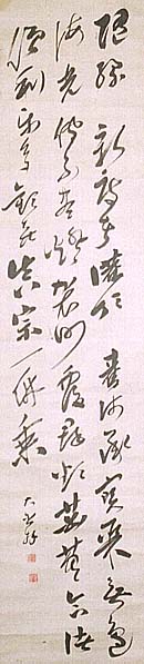 紙本肉筆・・縦108cm、横26cm 「大含拝」の下に、陰刻「大含印信」と「雲華」の落款が 押されている。雲華大含は豊後の人で、俗姓は末弘 氏、法名は大含、道号は雲華、雅号は鴻雪と称し、雲 華院大含と称した僧侶で、一般には雲華上人と称され ている。東本願寺の学職講師となった学徳兼備の名 海屋らと交流した文化人であるが、一方では、肉食妻 帯も平気と言う風流僧でもある。その書は懐素の風有 りとも称されている。 |