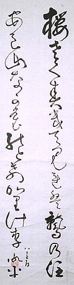 紙本肉筆・・縦132cm、横38cm 「櫻左く 春幾天見連盤 鷲乃住、 安良山な可農 能ど希加里計李」 「八十二翁胤平」の中に、陽刻丸印「椎園」の落款 が押されている。海上椎園は下総の人で、名は胤 平、号を椎園と称し、初め歌道を濤川胤苗に学び 、十七歳で江戸の千葉道場に入って北辰一刀流 の免許皆伝を受け、紀州藩の剣撃師範となり、そ の紀州で加納諸平に国学を学び、維新後は門弟 数千人に及んだ歌人である。 |