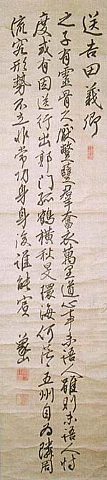 紙本肉筆・・縦138cm、横31cm 「送吉田義卿(松陰)」の後に文が書かれて居おり、「象 山」の下に、陰刻「啓又大星」と陽刻「子明氏」の落款が 押されている。佐久間象山は松代の人で、名は国忠・ 啓・大星、通称は修理、字は子明・子迪、号を象山と称 し、自ら済世を以て己が任とした、開国論者の儒者であ る。初め佐藤一斎の門に学び、大槻磐溪や梁川星巌ら と交わり時局を論じ、後に江戸で塾を開き経書や砲術 を教授し、その門下に吉田松陰らが現れるが、本人は 元治元年に京都で攘夷論者に暗殺される。本品は、信 州須坂(象山の故郷)からもたらされた、曰く言い難い「 伝」である。何となれば、書風は象山の書風であり、『増 訂象山全集』には、同様の「送吉田義卿」なる五言古詩 が存在する。其れを見ると16句の80字であるが、本品 は66字で古詩の体を成していない。古詩の3句1字目 は「振」であるが本品は「奮」であり、更に古詩の12・13 ・14の3句が本品には無く、逆に最後の句の前に「身」 の字が余分に有る、と言う具合である。後世の写しであ ればこの様な愚かな写しは無いし、倣写者が全くの無 知と言う事になる。しかし、全くの漢詩・漢文の無知者が 写した様にも思えない。では古詩を作る前の草稿であろ うか、本来漢詩の作品であれば、タイトルは終わりに書 かれるのが普通であるが、これはタイトルの「送吉田義 卿」が前に在れば、明らかに草稿の形である。しかし、 また草稿などに落款を押すであろうか。だが本品は、明 らかに長年架けられて来た形跡が見受けられる。恐ら く、草稿の段階で周囲に伝わったものに後で落款を、押 したものではないのか、と推測するが如何であろう、将 に「曰く言い難い」のである。 |