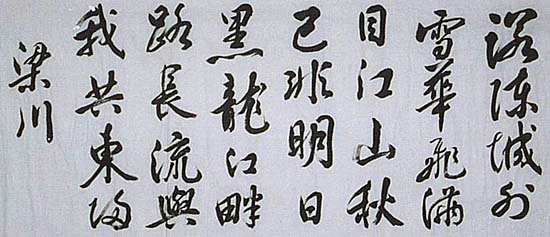 絹本肉筆・・縦34.5cm、横75cm 「梁川」の署名が有る。榎本梁川は江戸の人で、名は武揚、号を梁川と称し、幕臣の 海軍副総裁として、函館五稜郭で官軍と戦い、維新後は北海道開発に従事し、外相 や文相などを歴任した政治家である。本品は、席上で請われて急に認めた榎本の作 と、伝えられているが、伝世の榎本作品と比べると筆運びが些か柔らかい。ただ宴席 での酔筆と言われれば、その可能性が無い訳でも無い。因って一応「伝・榎本」として おくが、或いは全く別人の「梁川」かもしれない。 |