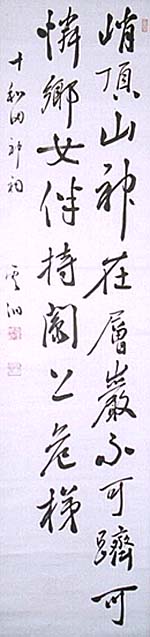 紙本肉筆・・縦133cm、横32cm 「雲洞」の下に、陰刻「重成印」と陽刻「子卿」の落 款が押されている。鈴木雲洞は山形の人で、名 は重成、字は子卿、号を雲洞と称し、幼時より厳 父の薫陶を受け、学才共に卓越していたが、日下 部鳴鶴の門に入って和漢の筆跡を研究して一家 を成した書家で、満鉄参事の職を辞した後は、書 道研究に専念して門人を養成している。昭和7年 に和風堂から『雲洞先生三体帖』を出している。 |