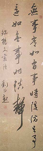 紙本肉筆・・縦96cm、横32cm 「劉伯起」の下に、陰刻「劉龍之印」と陽刻「伯起氏」の 落款が押されている。秋月橘門は豊後の人で、名は龍 、字は伯起、号を橘門と称し、十六歳で広瀬淡窓の門 に入り、次いで佐伯藩藩儒中島米華の家に寓し、更に 亀井昭陽の塾で徂徠学を学び、後に備前に至って医 学も学び、佐伯藩第十一代藩主毛利高泰の招聘に因 り、藩校四教堂の教授となった儒者で、詩文や書を善 くし、和歌にも長じている。 |