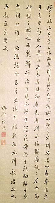 絹本肉筆・・縦108cm、横31cm 「梅軒池遷」の下に、陰刻「藤遷印信」と陽刻「敬 ?」の落款が押されている。菊池梅軒は紀州の人 で、名は遷・善、字は遷甫・善甫、号を梅軒と称し 、生卒年代は不明であるが、和歌山藩の文学を 務めた儒者菊池西皐(1769〜1813)の子で、 菊池三溪(1819〜1891)の父であれば、170 0年代末の生まれである事は明白である。和歌山 藩の藩儒となった儒者で、寛政九年刊『東皐琴譜 』や嘉永四年刊『済勝余興』等の、著作が有る。 |
