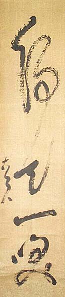 紙本肉筆・・縦133cm、横30.5cm 「古道人」の署名が有る。福田古道人は和歌山の人 で、名は世耕、字は子徳、号を静處(漢詩の時)・把 栗(俳句の時)・古道人(和歌・南画・その他の時)な どと称し、漢詩人にして俳人で、更に南画・和歌も善 くした人で、京都に住して特異な風格を示した文化 人である。「歸天一笑」と書かれている。この言葉の 如く、「一笑して浄土に旅立つ」ことが出来れば、幸 せである。 |