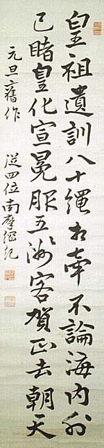 紙本肉筆・・縦134cm、横33.5cm 「従四位南摩綱紀」の下に、陰刻「南摩綱紀」と陽刻「 字曰士張」の落款が押されている。南摩羽峰は会津の 人で、名は綱紀、字は士張、号を羽峰と称し、初め藩 校日新館に学び、次いで江戸に出て昌平黌で経史百 家を修め、更に洋学を杉田成卿に、蘭学を緒方研堂 に学び、会津京都藩邸学識となり、維新後は淀藩に招 かれて督学となり、藩校明親館で教授した後、東京帝 国大学教授などを歴任した漢学者である。七言絶句 ではあるが、結句が八字(去の字が余分)の字余りで 二十九字であり、旧作を写す時の書き誤り作品であろ うと思われる。 |