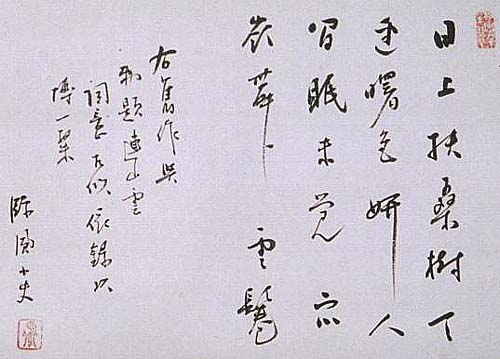 紙本肉筆・・縦24.5cm、横34.7cm 「臨風小史」の下に、陽刻「臨風」の落款が押されている。笹川臨風は東京の 人で、名は種郎、号を臨風と称し、東大在学中に岡田嶺雲らと筑波会を結成し て俳句研究に努め、卒業後は『帝国文学』編集員を経て、明大・法大・専大・駒 大などに出講して史学や美術批評を論じ、『東山時代の美術』で文学博士とな った文学者にして評論家であるが、同時に中国文学にも造詣が深く、国訳漢文 大成の『荀子』『唐宋八家文』を担当している。 |