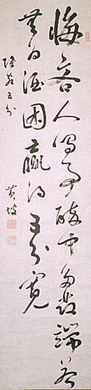紙本肉筆・・縦131cm、横31.7cm 「黄坡」の下に、陰刻「藤澤章印」と陽刻「字曰士明」の 落款が押されている。藤澤黄坡は大阪の人で、名は 章次郎、字は士明、号を黄坡と称し、藤澤南岳の次男 で漢学者である。大阪漢学の拠点の一つとなった泊園 書院は、江戸末の儒者藤澤東ガイ(田+亥)から始ま り、南岳(二代目)・黄鵠(三代目、南岳の長男)・黄坡 (四代目、南岳の次男)と受け継がれ、四代目黄坡を 以て終焉する。泊園書院の蔵書は、現在関西大学に 所蔵されている。 |
