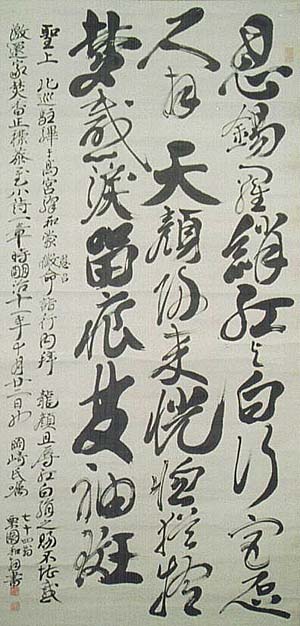 紙本肉筆・・縦136cm、横66.3cm 「七十四翁栗園和拝書」の下に、陰刻「邨和之印」と陽 刻「字子臧」の落款が押されている。中村栗園は豊前 の人で、名は和、字は子臧、号を栗園・半仙子などと 称し、本姓は片山氏であるが、水口藩儒中村篠山の 養子となって中村姓を名乗っている。初め帆足万里に 学び、次いで亀井昭陽の門に入り、更に京に出て篠崎 小竹や齋藤拙堂らと交わり、水口藩の儒臣として藩校 で教授した儒者である。 |
