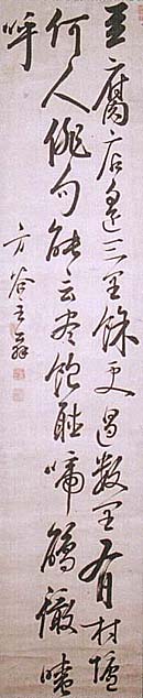 紙本肉筆・・縦131cm、横28cm 「方谷五翁」の下に、陰刻「山田球印」と陽刻「方谷」 の落款が押されている。山田方谷は備中の人で、 名は球、字は琳卿、号を方谷と称し、初め新見藩儒 丸川松隠に就いて宋学を学び、二十三歳で京に出 て寺島白鹿の教えを受け、備中松山藩藩校有終館 の会頭となるが、三十歳で江戸に出て佐藤一斎に 師事し、佐久間象山らと交わり、藩校の学頭となり 更に藩主の侍講となって、藩内の教学の振興に尽 力した儒者で、岡山の閑谷学校の再興にも尽力し ている。 |