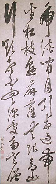 紙本肉筆・・縦127cm、横40cm 「服元喬」の下に、陰刻回印の「服元喬印」と陽刻の「 子遷氏」の落款が押されている。服部南郭は京の人で 、名は元喬、字は子遷、号を南郭・周雪・観翁などと称 し、十六歳で柳沢吉保に仕え、江戸に出て荻生徂徠 に就いて古文辞を学び、詩文に長じて文名を馳せ、画 や和歌も善くした儒者で、三十四歳で致仕した後は、 多くの来学者に教授し、晩年には肥後侯の賓師となっ ている。『唐詩選』を尊重して、当時の『唐詩選』流行に 大きな影響を与えている。 |