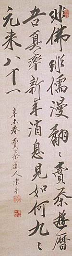 紙本肉筆・・縦101cm、横29cm 「辛未春賣茶道人東牛」の下に、陽刻「來觀」と陰刻「東牛之 印」の落款が押されている。梅樹軒東牛は京の人で、僧名 を來觀、号を梅樹軒・東牛・魁魁園などと称し、有馬や但馬 の寺に住していたが、江戸に出て煎茶を広め、その後大阪 高麗橋で茶店を開き、煎茶を教授しつつ和漢の煎茶道具を 売った売茶翁であるが、煎茶家系譜で石川丈山を元祖とし て、自らを七世の孫と位置づけ、売茶翁三代目(高遊外売 茶翁・八橋売茶翁・梅樹軒売茶翁)と名乗ったため、煎茶道 に於いてあまり評判の良くない人物である。 |