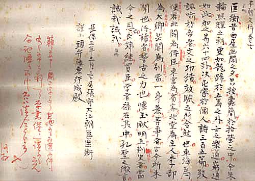 紙本肉筆・・手紙縦23.5cm、横13.7cm・文章縦23cm、横31.7cm 明治を代表する和様書作家翠雲多田親愛の問いに対し、『本朝文粋』巻七の 一節を筆写して答えた手紙である。大槻如電は江戸の人で、名は清修、字は 念卿、号を如電と称し、仙台藩儒大槻磐溪の子で、国語学者として『大言海』を 編集した大槻文彦の兄である。幼くして漢学・国学を修め、明治八年に弟文彦 に家督を譲って隠居し、学問三昧の生活を送り、非常な博学家として知られ、 日本音楽にも造詣の深い学者である。 |