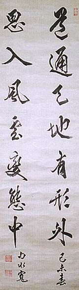絹本肉筆・・縦117cm、横33.5cm 「己未(大正八年・1919)書勺水寛」の横に、陰刻 「日下寛印」と陽刻「子栗氏」の落款が押されている 。日下勺水は下総の人で、古河藩士松高三右衛門 の次子であるが、日下姓を名乗り、名は寛、字は子 栗、号を勺水と称し、漢学を川田甕江や重野成齋に 学び、修史局に職を奉じて東大史学科講師を兼ね るが、職を辞して文墨に親しみ、塩谷青山らと迴瀾 社を創立し、『大正文学』を用いて文運の回復に尽 力した漢学者にして漢詩人である。 |