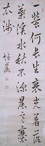紙本肉筆・・縦66.7cm、横21.2cm 「塩巌」の下に、陰刻「橋本晶印」と陽刻「三白氏」の 落款が押されている。橋本鹽巌は豊前の人で、本 姓は手島氏、名は晶、字は三白、号を塩巌と称し、 福沢諭吉の叔父に当たり、初め兄の中津藩儒手島 物斎や山川東林に学び、次いで熊本藩校時習館に 学び、中津藩校進修舘教授を務め、また兄物斎の 家塾誠求堂で漢学を講じ、中津の南画家菅沼松軒 らと度々詩会を開いている儒者である。 |