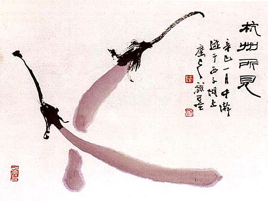 紙本肉筆・・縦26cm、横35cm 河野隆氏が中国杭州を旅された時のもので、畫と書と印が一体となった文人世界の作 品である。畫は紙幅のやや左より中央に茄子二本、書は右上に「杭州所見/辛巳一月 中瀚/遊于西子湖上/鷹之戯墨」と書され、その端に「隆」の陰刻方印と「子高」の陽刻 方印、更に紙幅の左下に「印餘」の陽刻長方印の三印が押されている。一瞬の技と冴 え有る筆遣いが、素朴にして且つ端正な玲瓏たる涼味の世界を作り上げている。 |