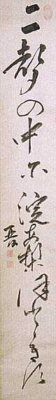 紙本肉筆・・縦93cm、横15.5cm 「晉」の下に、陰刻「三浦晉印」と陽刻「安貞」の 落款が押されている。三浦梅園は豊後の人で 、名は晉、字は安貞、号を梅園・洞仙・季山な どと称し、初め杵築藩儒綾部絅齋に学び、次い で中津藩儒藤田敬所の門に入り、更に長崎に 遊学して学んだ儒者で、天地造化の理に関心 を持って条理学を唱え、天文・物理・経済・博物 ・医学などにも通じた博学者で、詩書も善くして いる。本品は俳句で、「二聲の中に淀安梨保登 登ぎ須」と、達筆な筆遣いで書かれている。梅 園の俳句は珍しく、貴重な資料であろう。 |