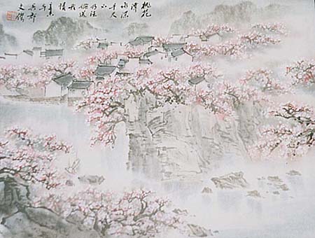 抑えた墨彩の中に点じた薄紅色が、桃源の様を良く表している。文傑