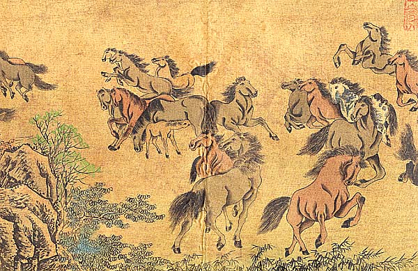 清朝の有名な「百馬圖」を絹布にコロタイプ印刷した複製の一部分である。不思議なことに、
