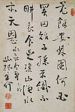 紙本肉筆・・縦27.4cm、横19cm 「如楓圭介」の下に、陽刻丸印「紅於」と陰刻「如楓」の落款が 押されている。大鳥如楓は播磨の人で、名は純彰、通称は圭 介、号を如楓と称し、医師小林直輔の子で、岡山の閑谷学校 で漢学を、大阪の適塾で医学を、江川塾で西洋砲術を学び、 歩兵奉行となった幕臣で、戊辰戦争では榎本武揚らと五稜郭 で官軍に抵抗するが、維新後は清国公使・朝鮮公使として活 躍した人である。 |