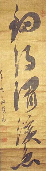 紙本肉筆・・縦89cm、横25.6cm 「七十九翁賢和」の下に、陽刻「墨齋」と陰刻回印「藤 賢和印」の落款が押されている。萩原墨齋は上野の人 で、本姓は藤原氏、名は賢和、号を墨齋と称し、代々 家塾を営む萩原家の長男として生まれ、幼少より家学 を授かり、十四歳で書家長沢宇勝の門にはいり、次い で江戸に出て三井親和に学び、関東に書名を鳴らした 書家で、利根の三筆(生方鼎齋・高橋不可得)の一人 である。尚、片山兼山に学んで古学と考証を主とし、江 戸で講説に従事した儒者萩原大麓(1752〜1811) は、墨齋の一族である。 |