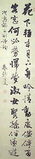 紙本肉筆・・縦133.5cm、横31.3cm 「春緑樵夫」の下に、陰刻「春緑樵夫」と陽刻「此 君山房」の落款が押されている。江川春緑は伊豆 の人で、名は英武、号を春緑と称し、幕末に幕臣 にして兵学者であり、且つ書画も巧みで、その門 下に佐久間象山や桂小五郎・橋本左内・大槻磐 渓・黒田清隆らを輩出した江川坦庵(1801〜18 55)の五男で、九歳で韮山代官となった幕臣であ るが、維新後は県令となり、岩倉使節団に随行し て米国留学し、帰国後は地域教育に尽力した人 である。 |