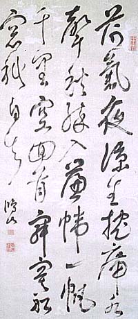 紙本肉筆・・縦126cm、横48cm 「鴻山」の下に、陽刻「士順」と「高井健印」の落款が押 されている。高井鴻山は信濃の人で、名は健、字は士 順、号を鴻山と称し、京で書を貫名海屋に、画を岸駒 親子に、詩文を梁川星巌に、漢学を佐藤一斎に学び、 大塩平八郎や佐久間象山らと交遊し、晩年の葛飾北 斎を小布施に招くなど、地方文化の発展と窮民の救済 に尽力し、小布施に高矣義塾を開くなどした、文人豪 農である。 |