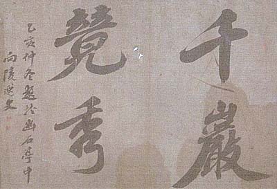 紙本肉筆・・縦27.6cm、横40cm 「向陵逸史」の下に、陽刻「瑛之」と「白華」の落款が押されてい る。多賀谷向陵は江戸の人で、名は瑛之、字は白(伯)華、号を 向陵・五石などと称し、尾張生まれであるが江戸に住み、書を 細井竹岡に学んだ幕臣の儒者で能書家である。上州島村の豪 農で俳人の金井文八郎(華竹庵萬戸)の妻春栄(医家多賀谷養 元の娘)は、彼の従妹である。「乙亥仲冬題於幽石亭中」と有れ ば、文化十二年(1815)の作である。 |