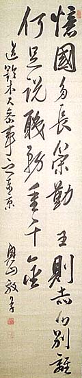 紙本肉筆・・縦127cm、横27cm 「奥山毅草」の下に、陰刻「奥山毅印」と陽刻「金剛 山人」の落款が押されている。奥山金剛は下館の人 で、名は毅、号を金剛と称し、幕末の下館藩次席家 老を務めた儒者である。俳人として有名な妻の奥山 李卿が、享和元年(1801)の生まれであれば、金 剛の生まれは1790年代と推測される。尚、明治八 年刊の田島定邦編『蚕桑余事』の中には、「抵桐生 途中」と題する金剛の七言絶句が採取されている。 |